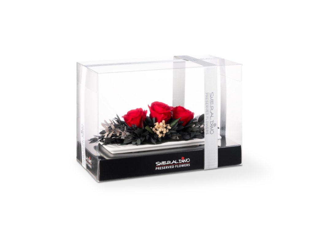 Překvapte své blízké nebo dopřejte sobě luxusní Aranži růží na keramickém tácku v dárkové krabičce – symbol nekonečné elegance a péče, který zanechá nezapomenutelný dojem. Tato nádherná, trendy stabilizovaná červená růže není jen obyčejná květina. Je to mistrovské dílo přírody, konzervované speciální technologií tak, aby si zachovalo svou dokonalou svěžest, barvu a jemnost po neuvěřitelných minimálně 2 roky!