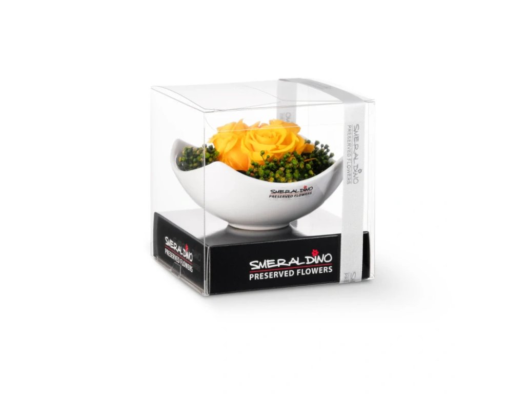Darujte aranži žlutých růží v keramické misce. Jedná se o aranži stabilizovaných žlutých růží v dárkové krabičce. Vydrží věčně bez vody, nevyžadují údržbu. Perfektní dekorace do bytu i kanceláře. Dokonalý dárek!